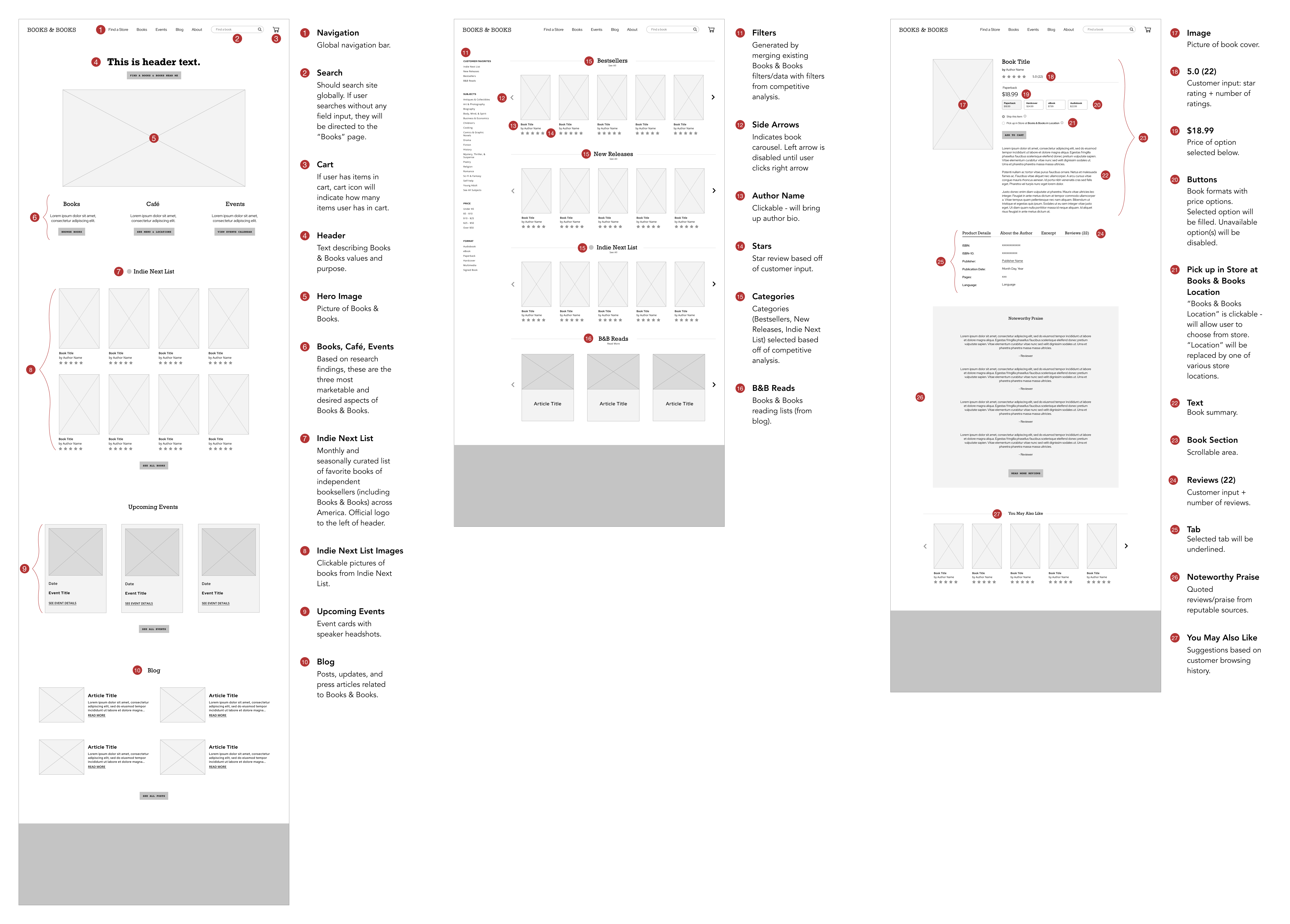 I then came up with annotated wireframes for the homepage and books pages.
