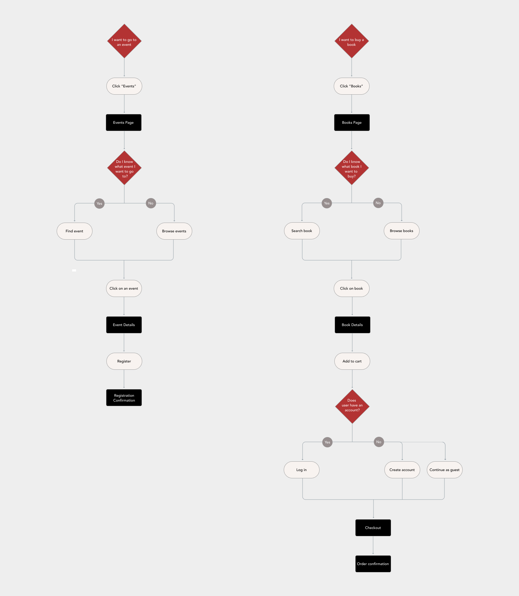 Based on my user research findings and persona, I decided to focus on the book checkout and event registration flows because they seemed to be the most marketable and desired aspects of the Books & Books website.